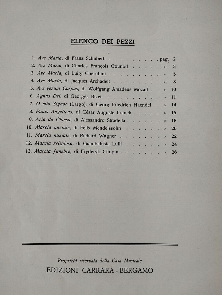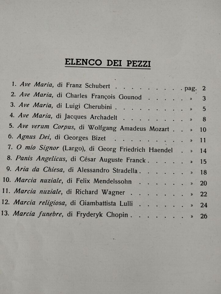 - Selection of Famous Pieces : A total of 13 pieces ranging from "Ave Maria" to "Marcia Nuziale" to the moving "Marcia Funebre".