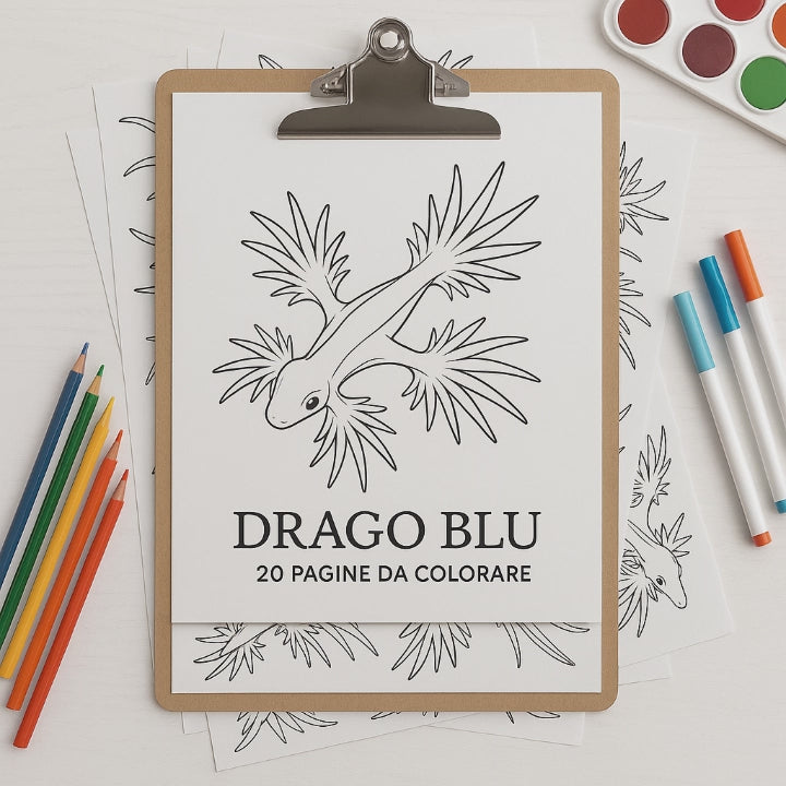 Bring home the allure of the blue sea dragon (Glaucus atlanticus) with an exclusive set of 20 black and white coloring pages, optimized for A4 printing and perfect for both children and adults. The illustrations feature clean lines, increasing levels of difficulty, and different perspectives (from top view to three-quarter view), so you can choose between simple or detailed fills. Each page is in high-resolution PNG format (300 DPI) in a convenient ZIP file: print, color with pencils, markers, or light watercolors, and use the images for creative activities, school workshops, stress-relieving activities, and mindfulness. Contents: 20 PNGs (A4, 300 DPI) + README, immediate digital delivery; this product is for personal use (for other uses, please contact us). The subject is the famous marine nudibranch known as the sea dragon or blue sea slug: a current and sophisticated theme that combines nature, science, and creativity.