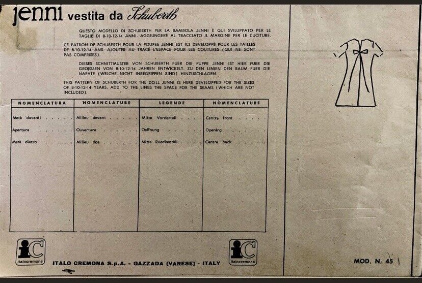 We offer the "Jenni Dressed as Schuberth" doll dress pattern on a physical sheet. This pattern is suitable for dolls aged 8, 10, 12, and 14 and includes detailed instructions and sewing diagrams.
