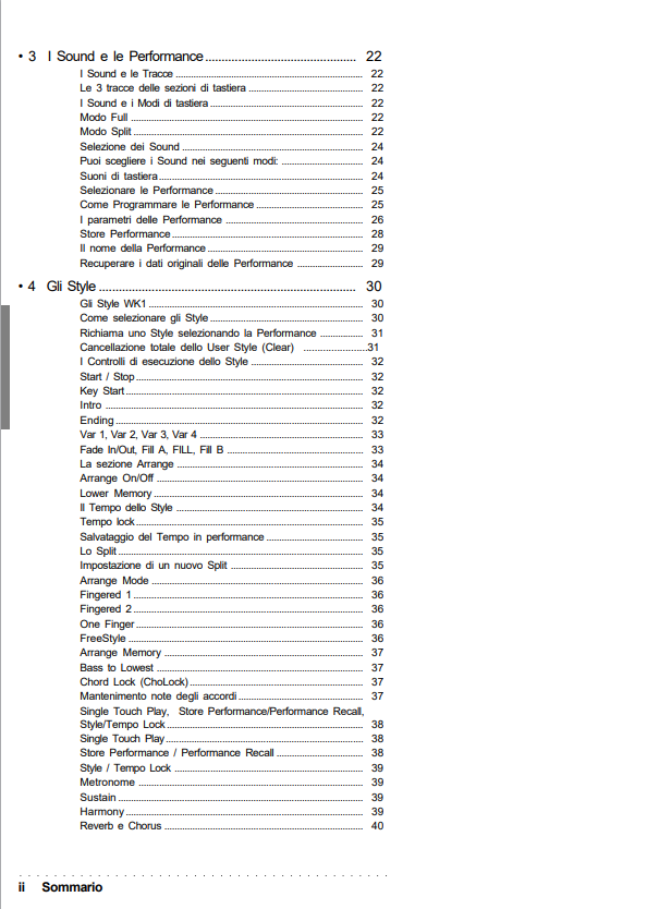 - Getting Started: Turning on, selecting performances, using the keyboard and effects.