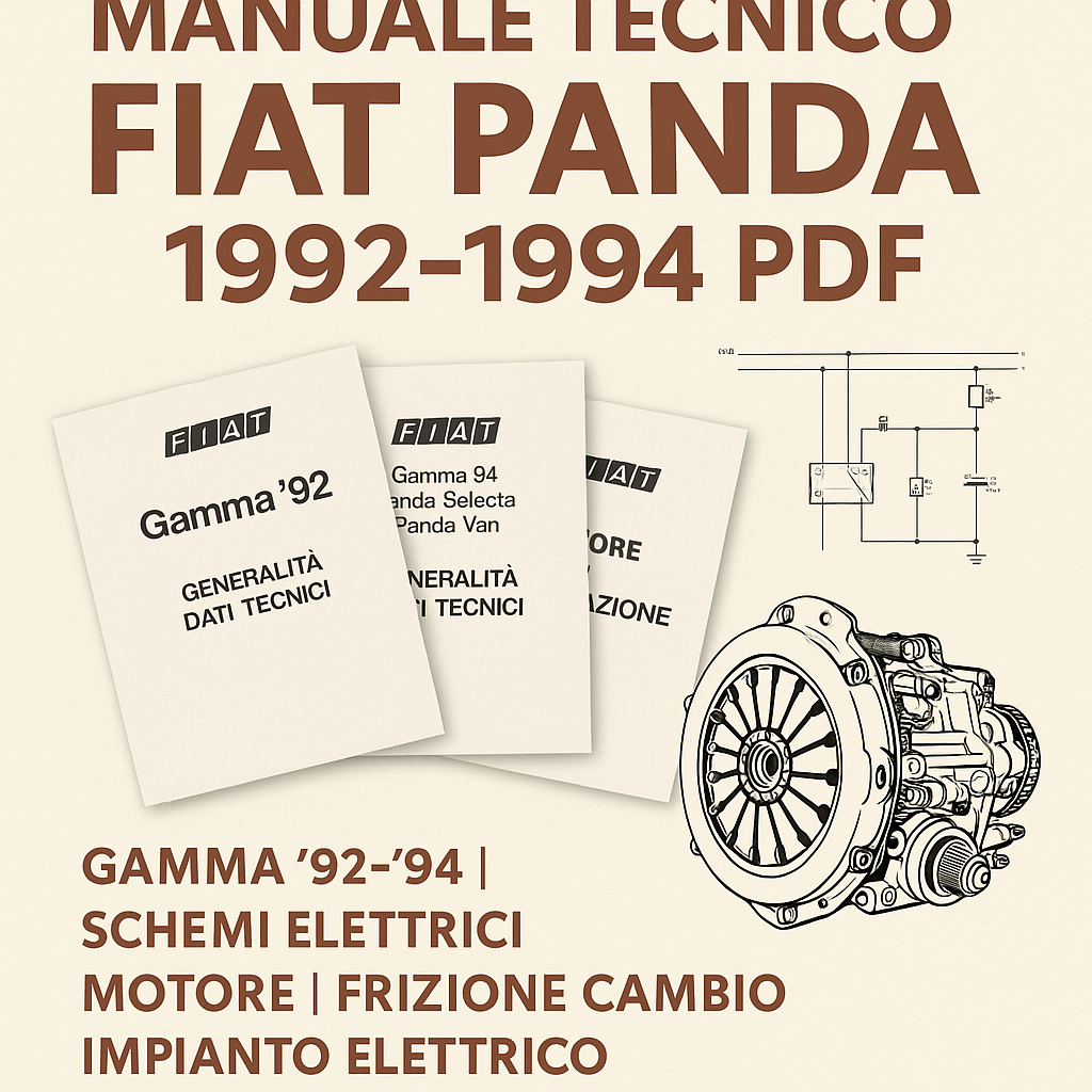 Discover the Complete Technical Manual for the 1992-1994 Fiat Panda in PDF format! An exclusive collection of original documents that includes technical data, maintenance instructions, wiring diagrams updated to 1994 and 1998, and sections dedicated to the engine, clutch, transmission, brakes, steering, and suspension. Perfect for restorers, collectors, mechanics, and classic car enthusiasts who want to restore a Fiat Panda to its original glory. The manuals are organized in convenient PDF files for quick and accurate reference, ideal for printing or using on digital devices. An excellent resource for repairs, maintenance, or simply to enrich your Fiat historical documentation. Buy now and receive your digital download immediately!