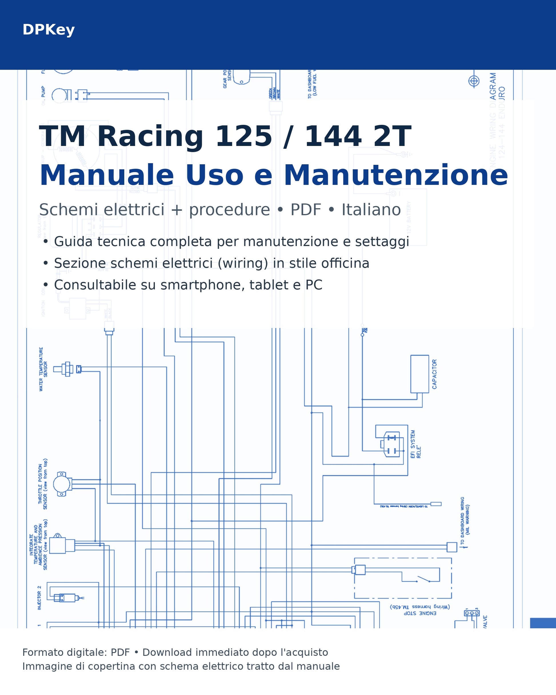 Se guidi una TM Racing 125 o 144 2 tempi e vuoi una guida chiara per uso, controlli e manutenzione, questo PDF ti aiuta a mantenere la moto efficiente e sicura: dal riconoscimento del modello alle regolazioni, fino a tabelle manutenzione, dati tecnici e schemi elettrici.